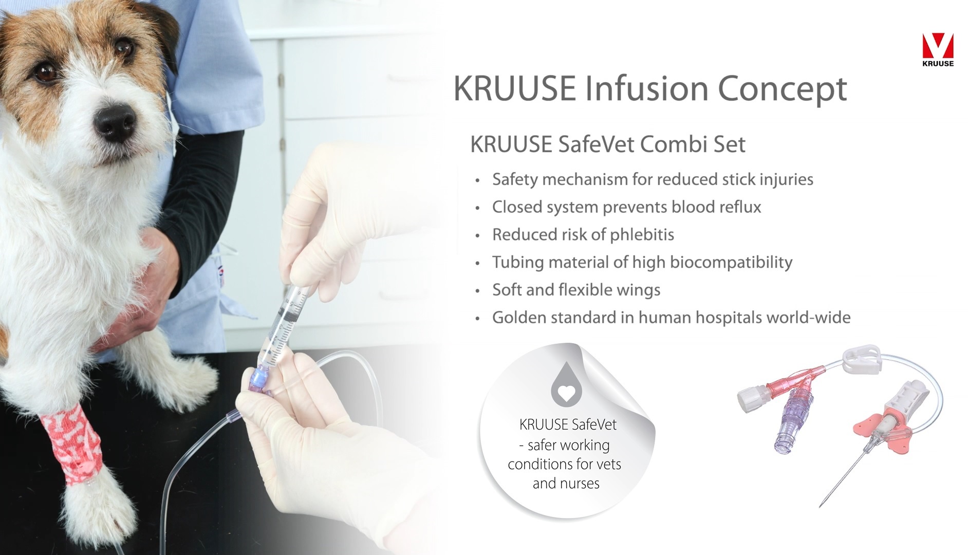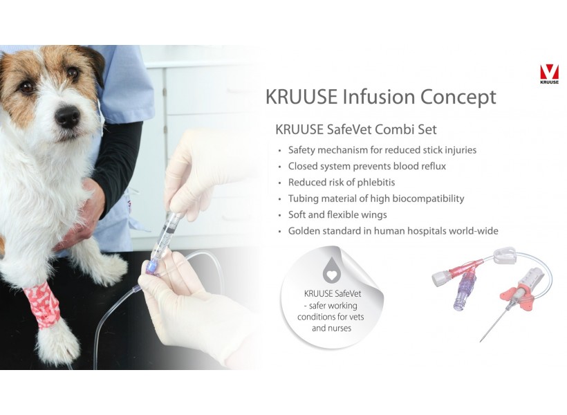 The KRUUSE SafeVet combi set minimises the number of manipulations, thus reducing the risk of contamination and accidental disconnection of the IV catheter. The risk of mechanical phlebitis is markedly reduced as the work and handling of the device is separated from the catheter tubing vein inlet - making this the gold standard in human medicine.