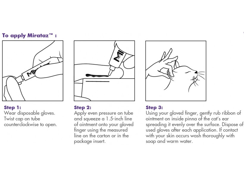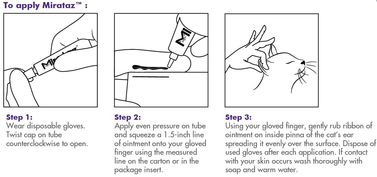 Mirataz® between the left and right inner pinna of the ears. Do not administer into the external ear canal. If deisred, the inner pinna of the cat's ear may be cleansed by wipping with a dry tissue or cloth immediately prior to the next schedule dose. If a dose is missed, apply Mirataz® the following day and resume daily dosing.