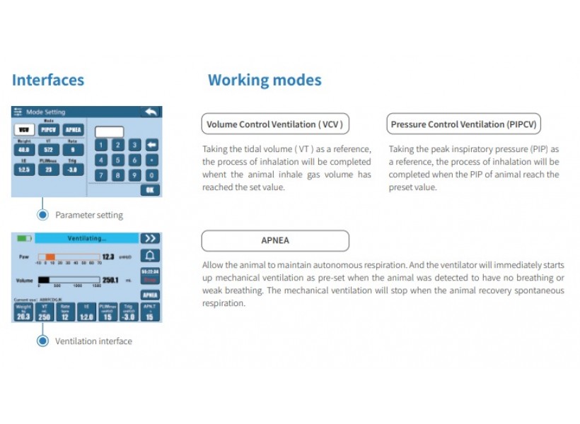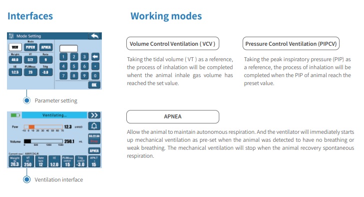 R419 interllihent animal ventilator as mechanical ventilation device, which is completely according with veterinary clinical practice. There are 3 modes of operation, including VCV, PIPCV and APNEA, to meet mulitiple clinical applications.